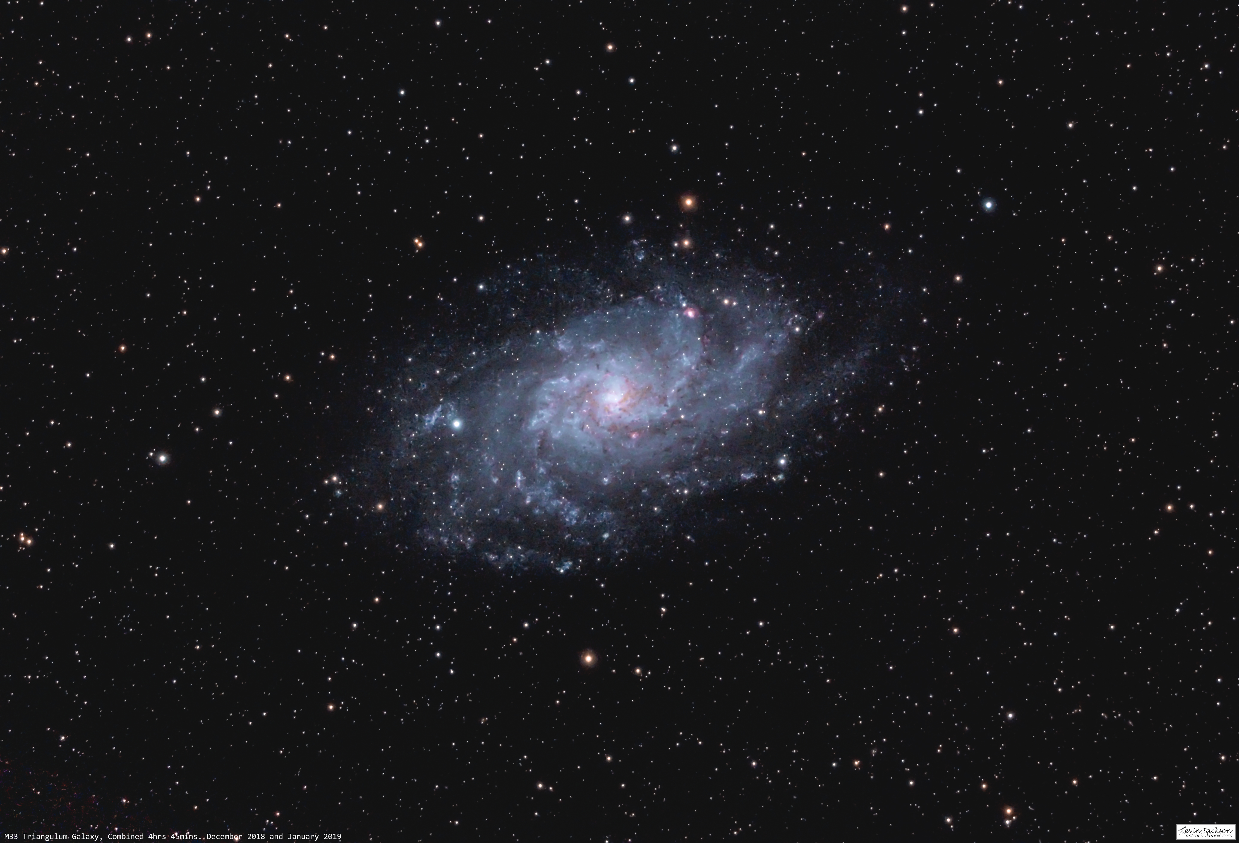 M38 Triangulum galaxy Combined the final results of processing from 3 separate processed sessions in Astro Pixel Processor. Tidied up in Adobe CC. Kevin Jackson