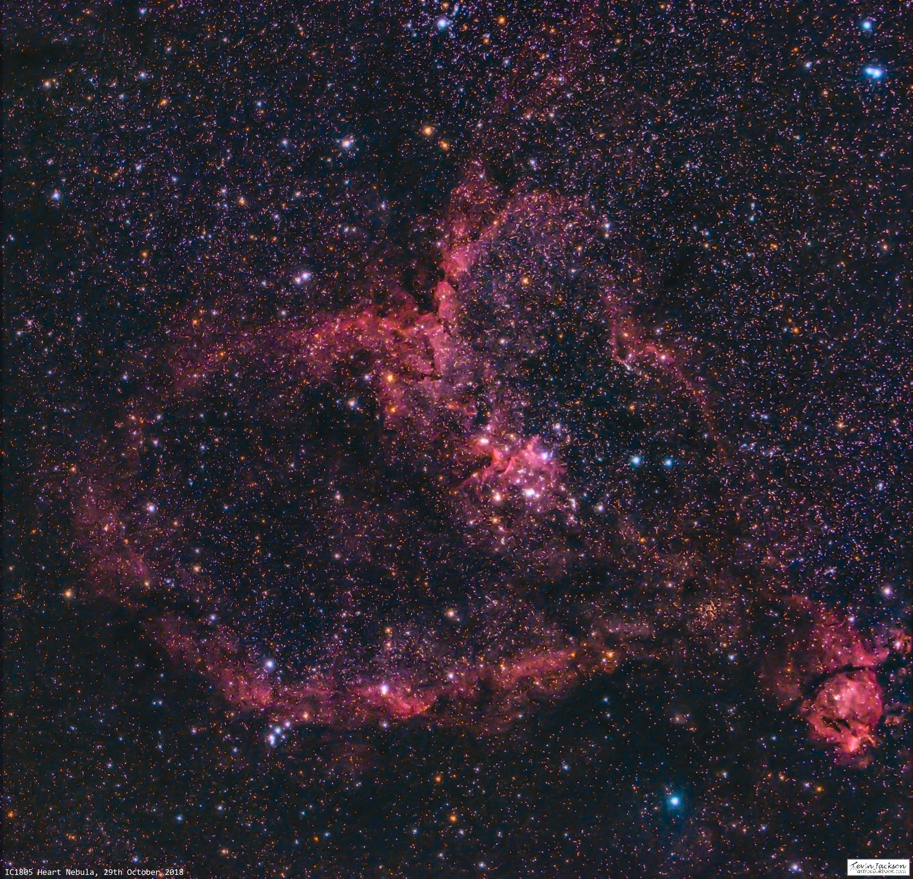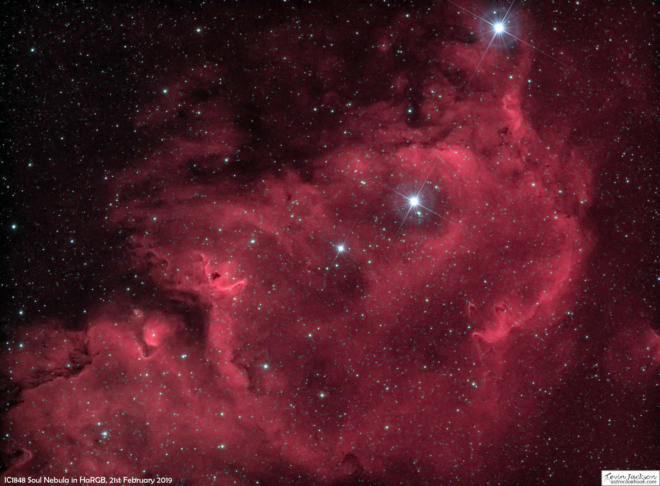 IC1848 Soul Nebula in HaRGB Scope 1: Altair Astro 102ED-R with Lightwave 0.8x Reducer Camera 1: ZWO ASI1600MM with ZWO Ha Scope 2: TSAPO65Q with TeleVue NPR-1073 0.8x Reducer Camera 1: ZWO ASI294MC Pro with Optolong L-Pro Mount: StellarDrive 6R Guide: SkyWatcher EvoGuide + Altair 130M Subs: Ha: 18×300 Secs + RGB: 11×600 SecsProcessed in APP, Combined + Finished in Adobe CC Kevin Jackson