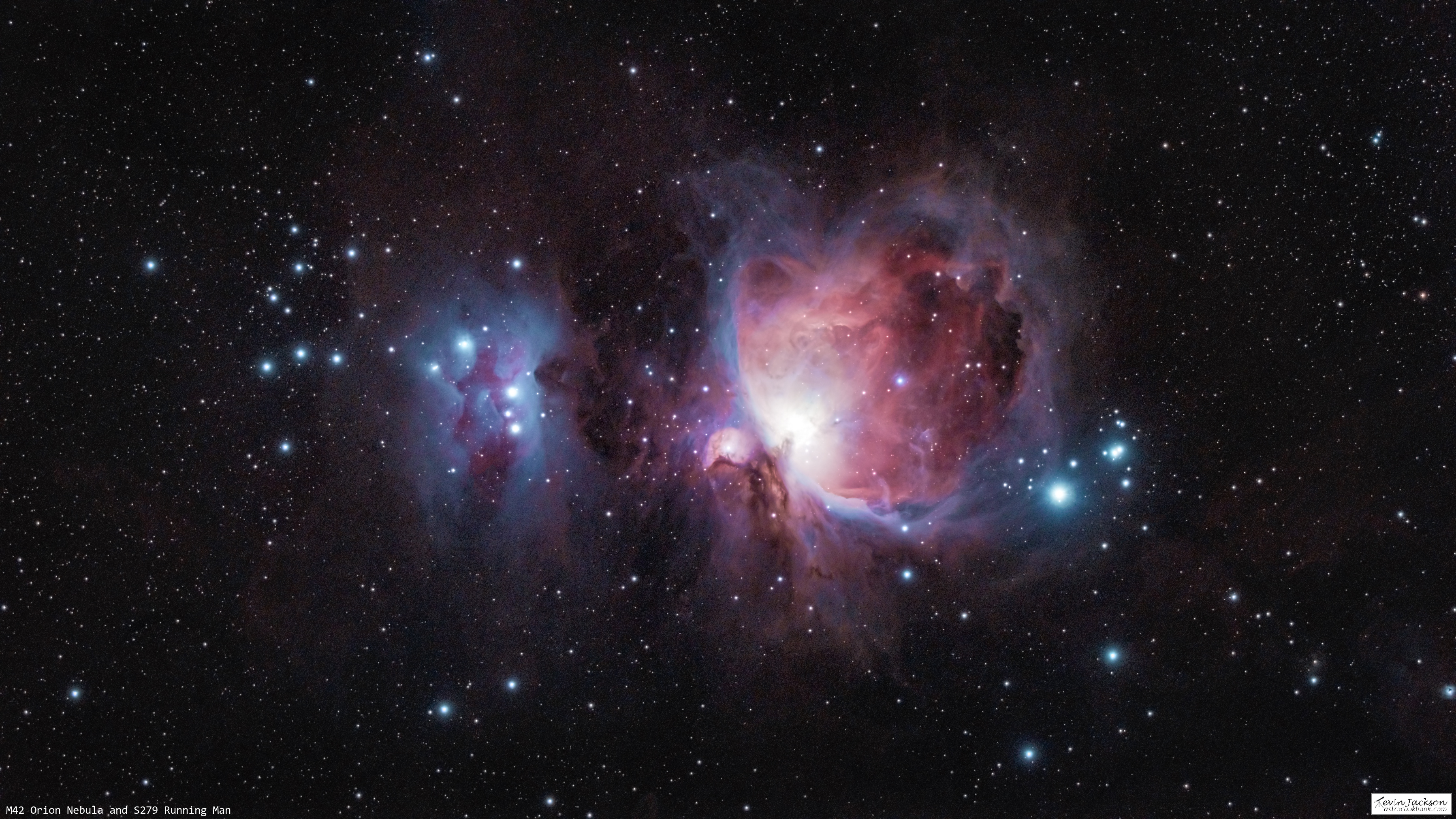 M42 Orion + Running Man multi-session: Total 1hr 46mins. Scope: TSAPO65Q + TeleVue NPR-1073 0.8X Reducer. Camera: ZWO ASI294MC Pro + Optolong L-Pro Filter. Mount: StellarDrive 6R. Processed in Astro Pixel Processor. Finished in Adobe CC. Kevin Jackson