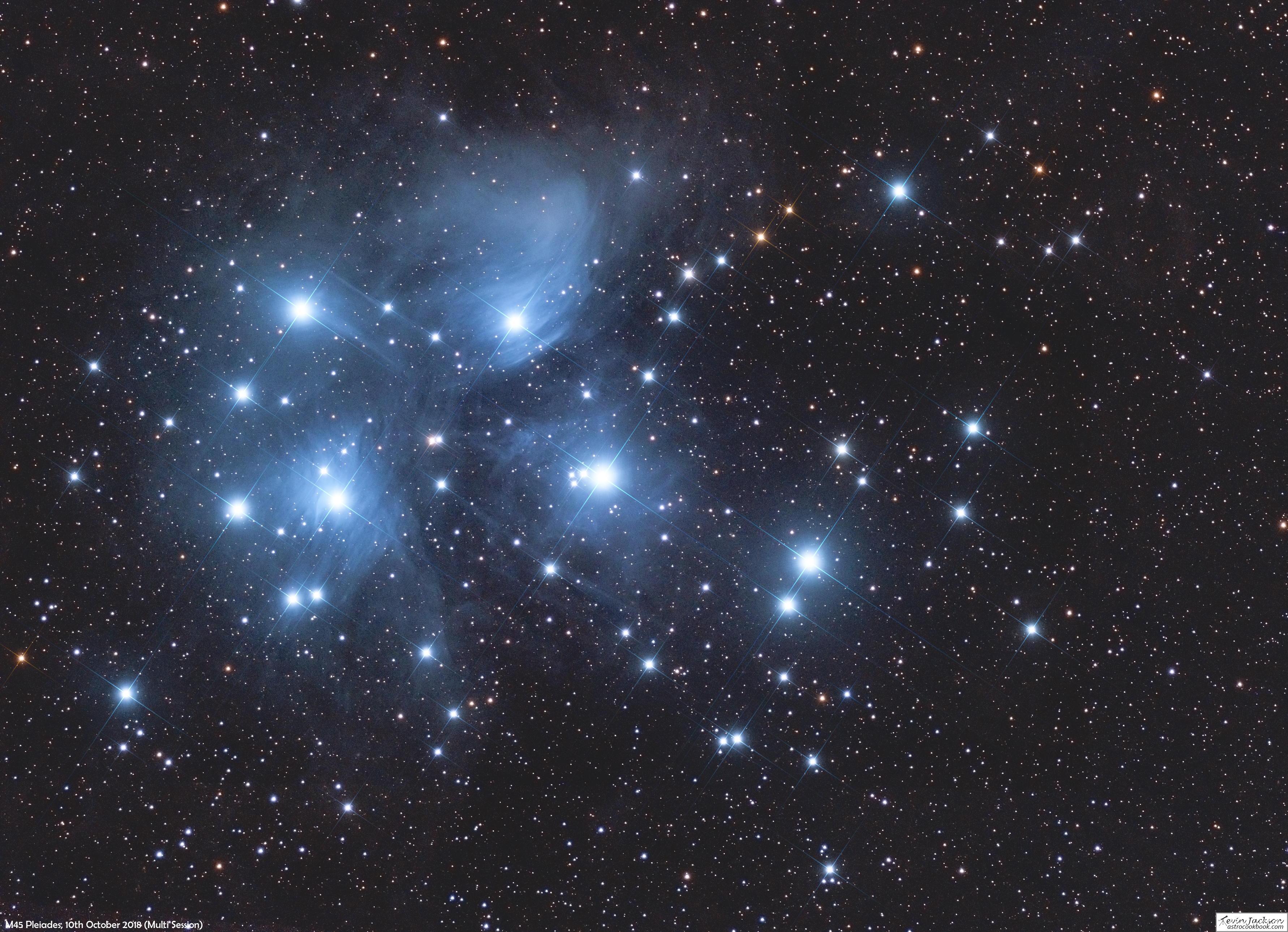 M45 Pleiades from multiple days. Scope: TSAPO65Q. Mount: SkyWatcher EQ6-R Pro. Camera: ZWO ASI294MC Pro. Guiding: Altair GPCAMv2 130M with Orion 50mm. Total 162 Minutes. Captured in SharpCap Pro. Multi-Session Processed in APP. Finished in Adobe CC. Kevin Jackson