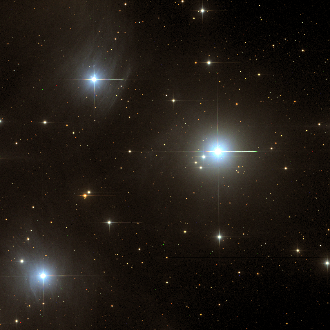 Image of 3 of the bright central stars in Messier45 (Pleiades) taken by Hayden Tynan. Maia (top), Electra (centre), and Merope (bottom) . This open star cluster lies c.444 light years away.